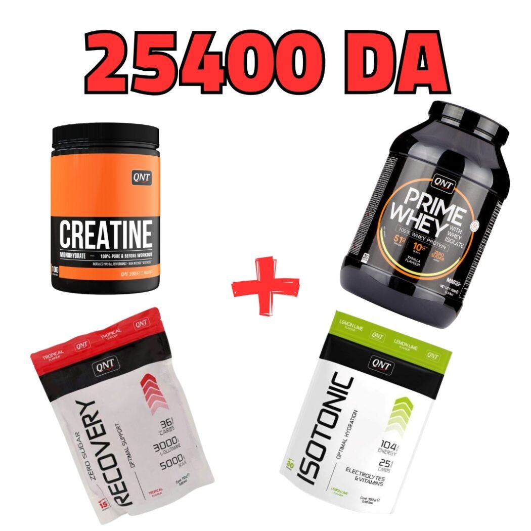 Pack Mass: Isotonic QNT+Recovery Qnt+Creatine 300g Qnt+Prime Whey 1kg Qnt السعر الأصلي هو: د.ج 31.900,00.السعر الحالي هو: د.ج 21.400,00.